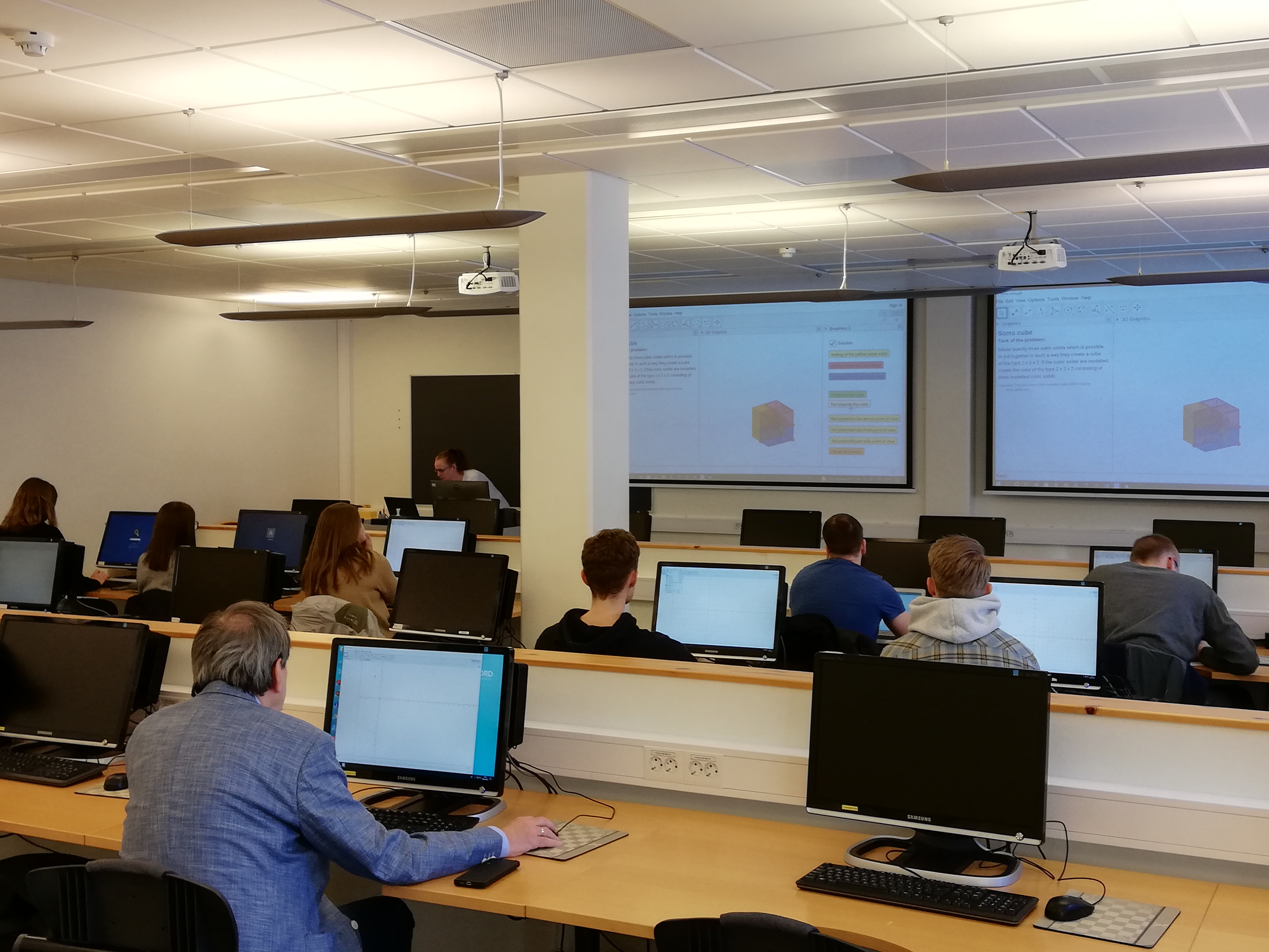 Daniela Bímová lektorovala workshop s názvem „GeoGebra and spatial reasoning“ určený pro studenty studující na NORD University studijní obor učitelství matematiky pro 2. stupeň ZŠ. Workshopu se kromě členů projektového týmu zúčastnilo 9 studentů – budoucích učitelů matematiky a také jedna členka katedry Mathematics Teaching & Learning z NORD University. Obsahem workshopu byla tvorba dynamických appletů ve freewaru GeoGebra. Studenti pod vedením lektorky vytvářeli virtuální modely krychlových těles, které byly dílčími částmi tzv. soma kostky. Nejenže studenti za pomoci lektorky, využití dynamických nástrojů softwaru GeoGebra a vizuálně-prostorových schopností zvládli virtuálně nastavit skládání a rozkládání soma kostky, ale také se naučili připravit vytvořené virtuální modely pro jejich následný 3D tisk.