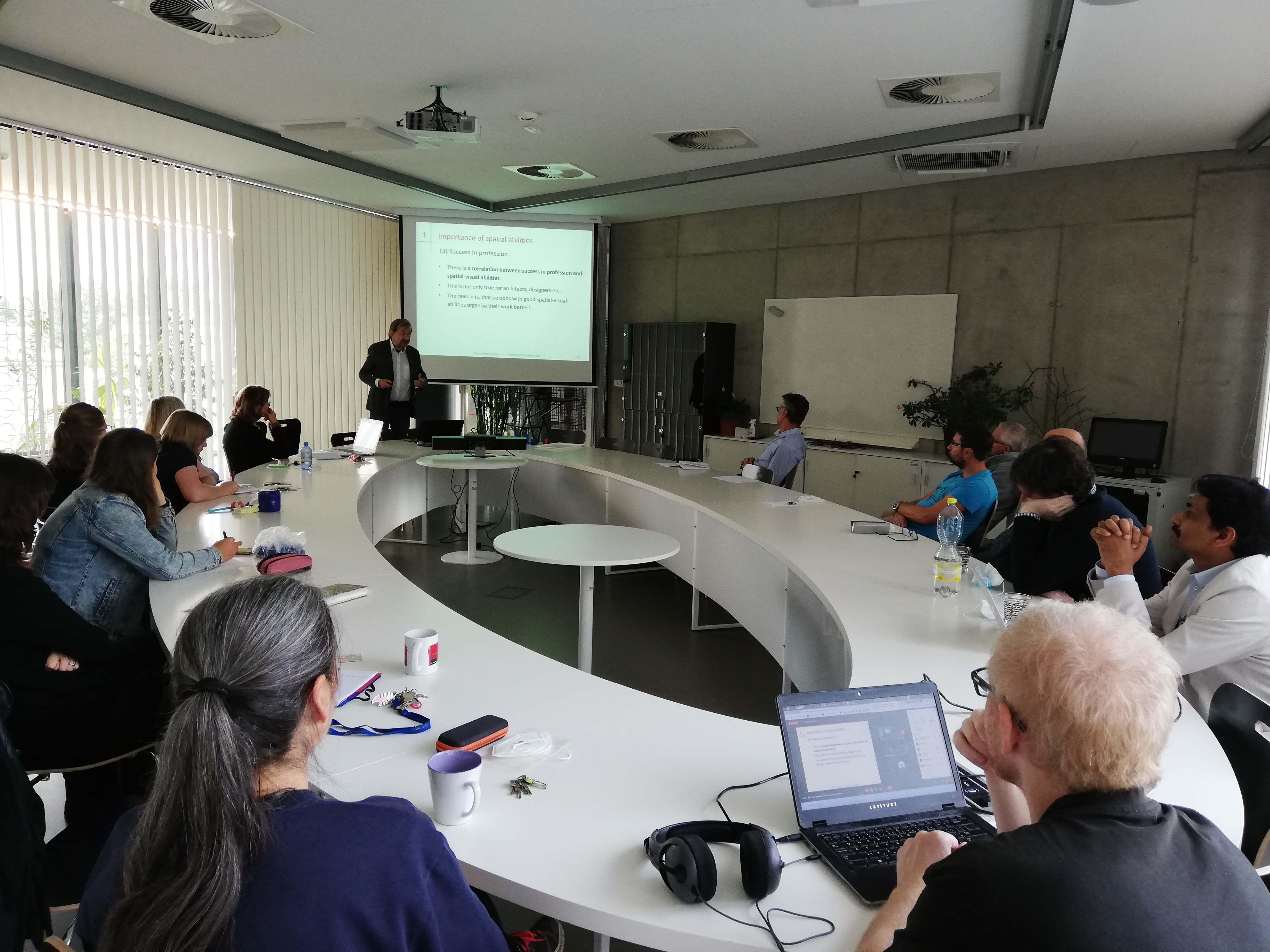 Členové projektového týmu se setkali u kulatého stolu, kde hovořili o diverzitě žáků ve výuce geometrie, resp. o rozvoji a procvičování vizuálně-prostorových schopností žáků v souvislosti s modelováním virtuálních modelů prostorových objektů jako podkladů pro 3D tisk fyzických modelů. Diskutovali také o aktuálních otázkách projektu, tj. o 3D tisku fyzických výukových modelů odpovídajících objektům objevujícím se v úlohách vložených na interaktivní webové stránce Mathematikus, o možné účasti a prezentaci výsledků projektu na národních a mezinárodních konferencích, o psaní společných článků do odborných časopisů apod.