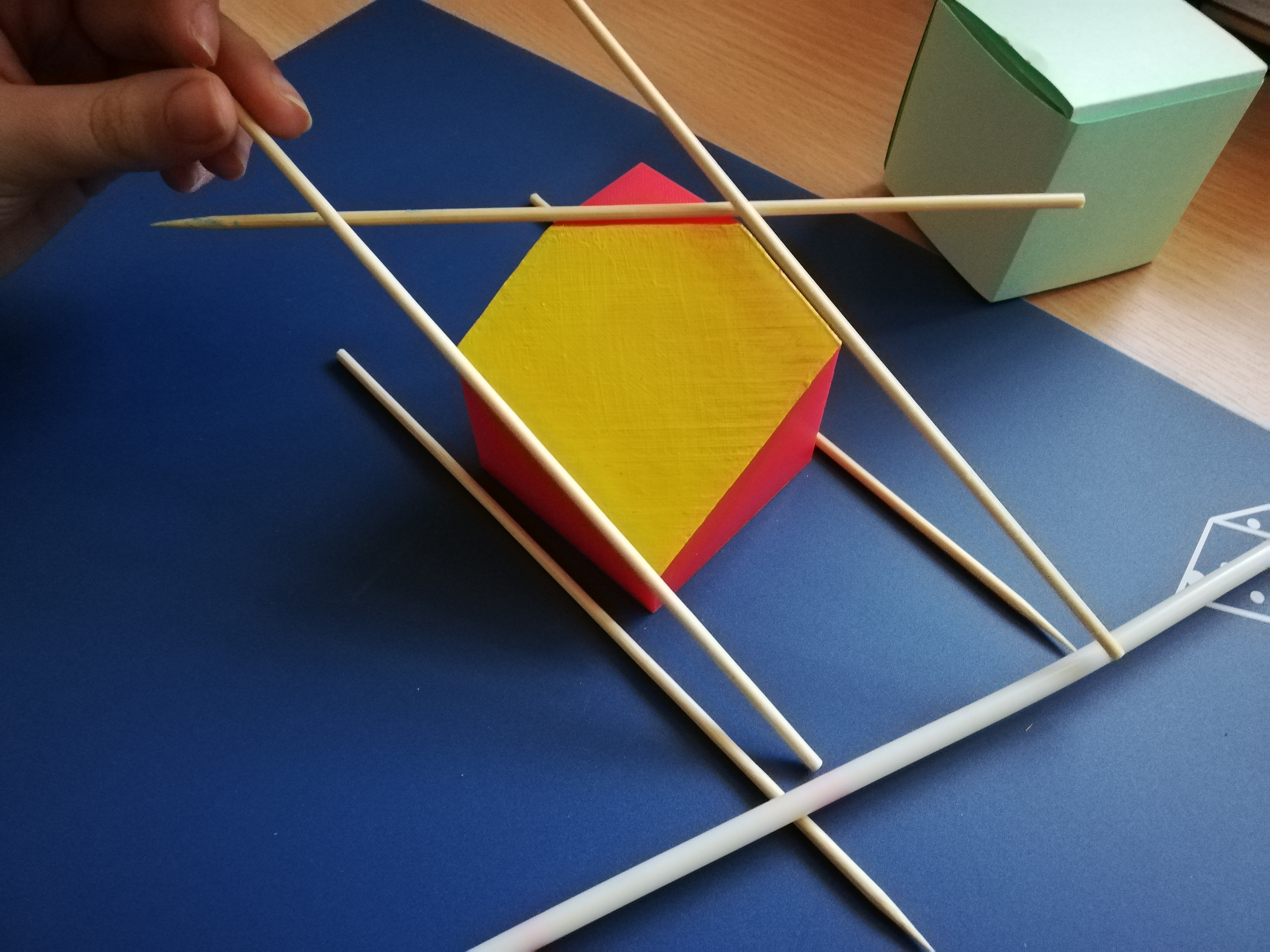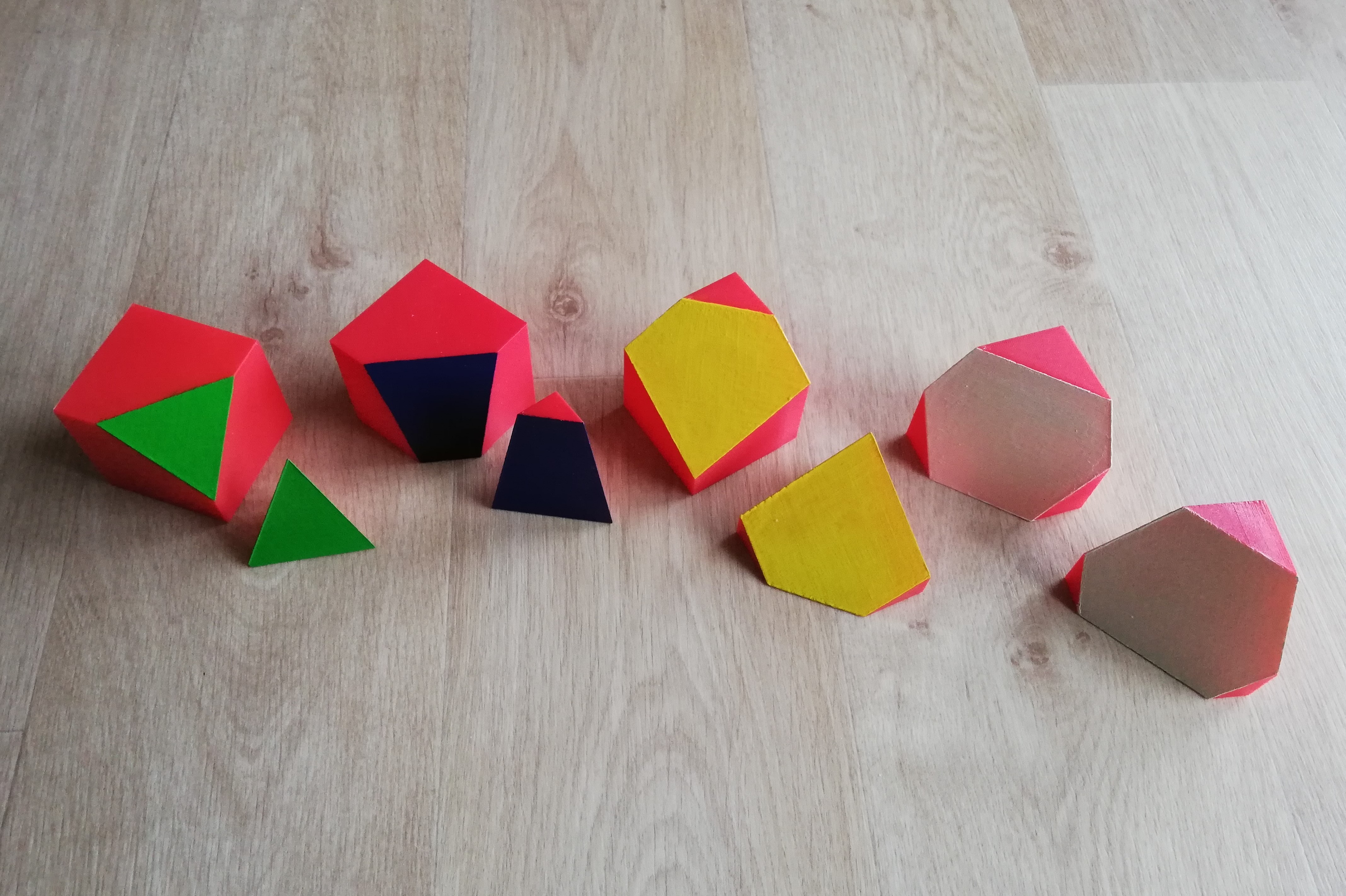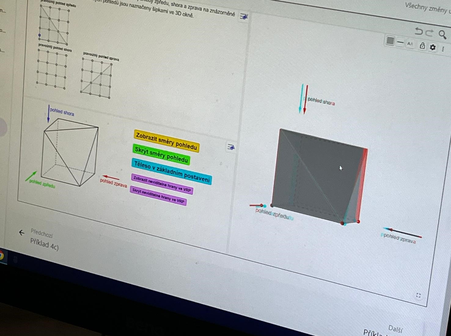 V septimě jsme naopak kapitolu ze stereometrie vyučovali od samotného začátku. Nejprve byly představeny základní geometrické pojmy a jejich vzájemné polohy. S využitím 3D vytištěných fyzických modelů základních těles bylo zopakováno vymezení pojmu geometrické těleso a byly uvedeny názvy jednotlivých základních těles. Modely základních těles byly následně zobrazovány dle pravidel platných pro zobrazování ve volném rovnoběžném promítání (VRP). Při zobrazování modelů základních těles ve VRP byly s výhodami využívány jak 3D vytištěné fyzické modely základních těles, tak i krokované konstrukce vytvořené v podobě dynamických appletů ve freewaru GeoGebra.