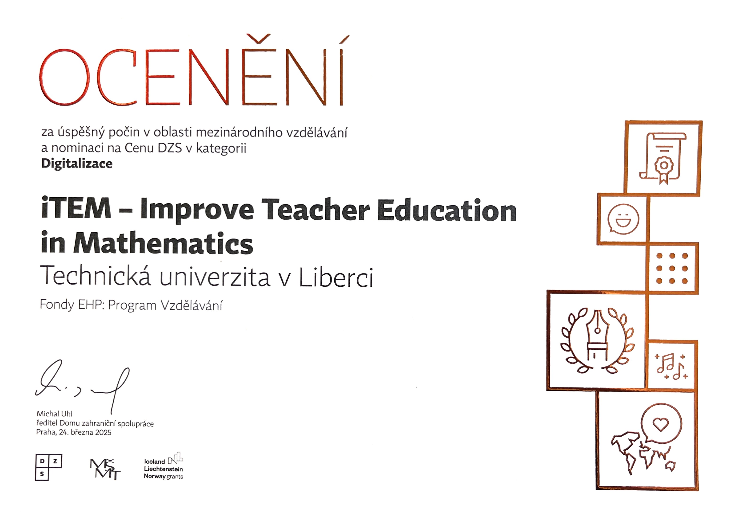 Projekt iTEM - Improve Teacher Education in Mathematics (č. EHP-CZ-ICP-2-018) byl jedním z šesti nominovaných projektů v kategorii Digitalizace v soutěži Ceny DZS 2024. Slavnostní vyhlášení Cen DZS 2024 proběhlo v pondělí 24. března 2025 v pražském Rudolfinu. I když se náš projekt nestal v kategorii Digitalizace absolutním vítězem, je už samotná nominace pro všechny členy projektového týmu oceněním za společnou tvůrčí a výzkumnou práci.