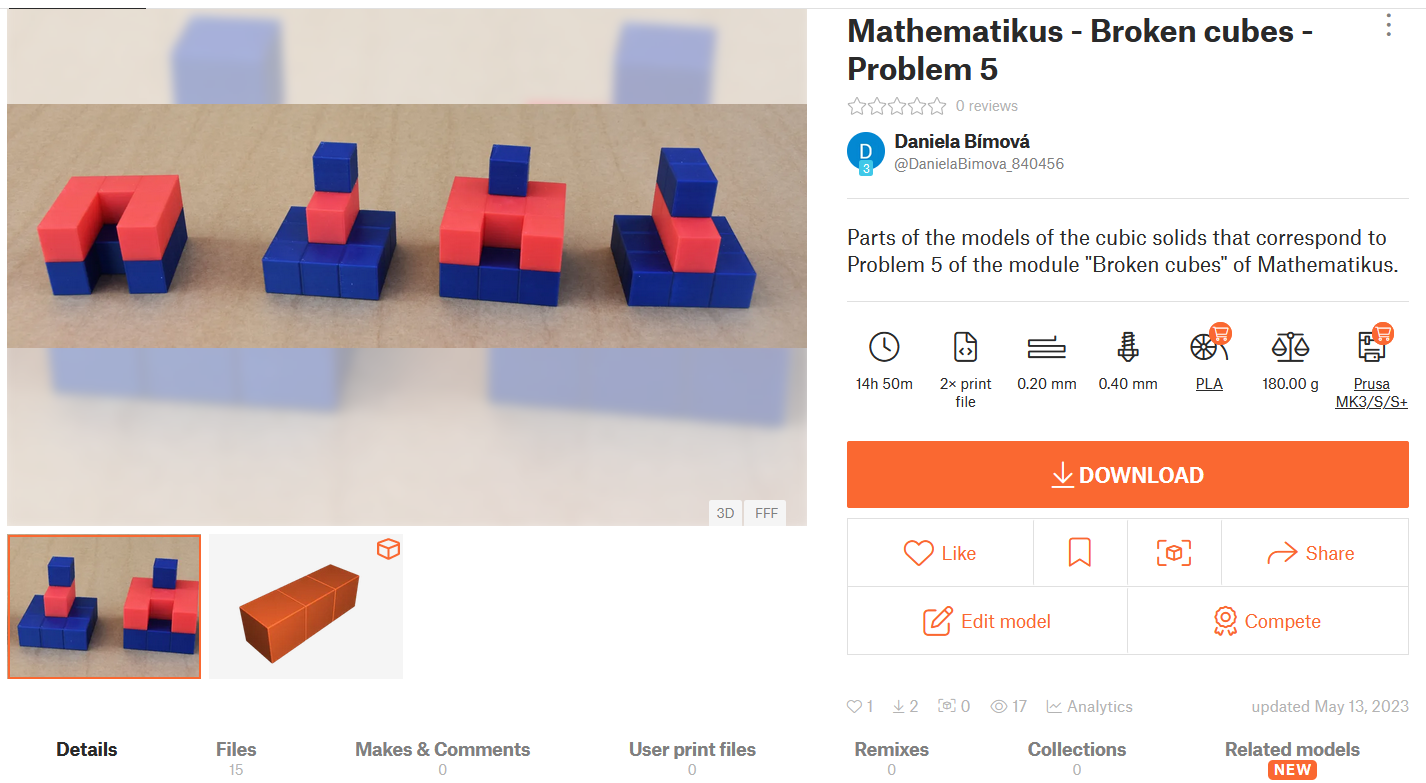 Na weblinku https://www.geogebra.org/m/rpgjcyn3 je umístěna GeoGebra kniha s náměty úloh vhodnými k rozšíření internetové webové stránky www.mathematikus.de a také s úlohami, které byly pilotně ověřovány společně s 3D vytištěnými fyzickými modely krychlových těles a ořezaných krychlí při výuce matematiky žáky 8. a 9. třídy ZŠ Broumovská, Liberec v květnu 2023.