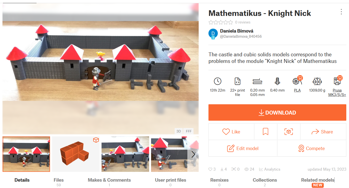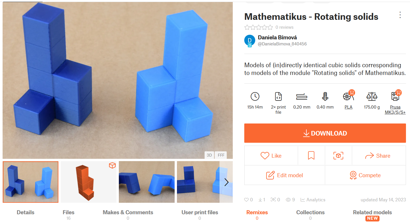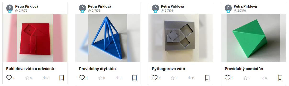 Abstrakt: Využívání digitálních technologií při výuce považujeme za přirozenou součást moderního způsobu vyučování. Mnohým žákům mohou cíleně naprogramované virtuální animace, umístěné např. na interaktivní webové stránce Mathematikus, pomoci s vytvářením správných představ 3D modelů či prostorových situací. Existují ale také žáci, kteří potřebují pro tvorbu správných představ zapojit více smyslů, kromě zraku např. také hmat. Proto jsme vymodelovali a následně vytiskli odpovídající 3D modely pro vybrané úlohy z Mathematikusu.