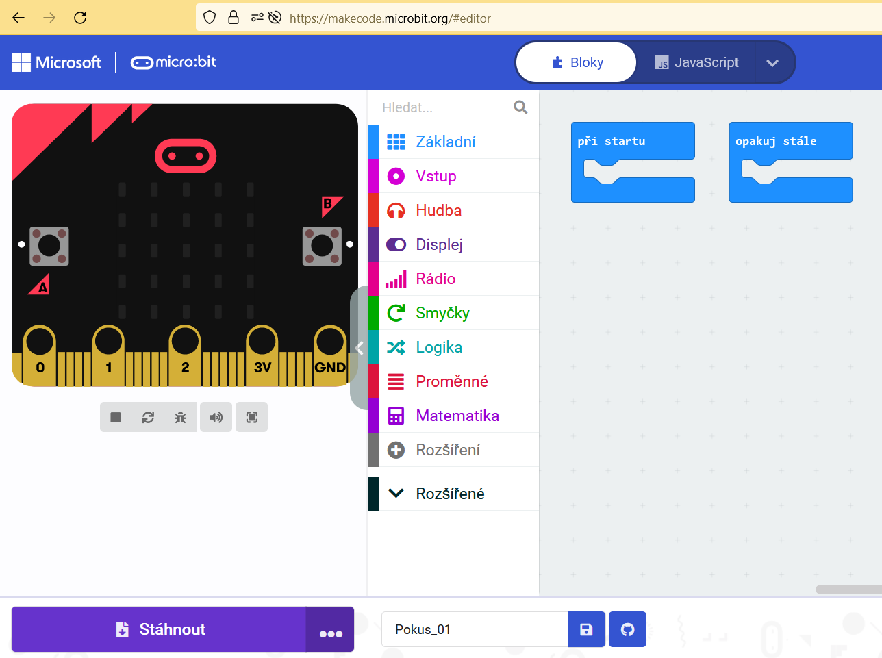 Poznámka: Uvedený weblink odkazuje na micro:bit projekt v norštině. V prohlížeči Google Chrome lze příslušnou webovou stránku přeložit pomocí Google překladače, přesněji po stlačení pravého tlačítka myši kdekoliv na webové stránce se objeví plovoucí okno, v němž je třeba vybrat příkaz "Přeložit do jazyka ... ." V následujícím zobrazeném okně pak vyberte jazyk "čeština". Příkazy blokového programovacího jazyka se v prohlížeči s nastavenou češtinou automaticky zobrazují v češtině.