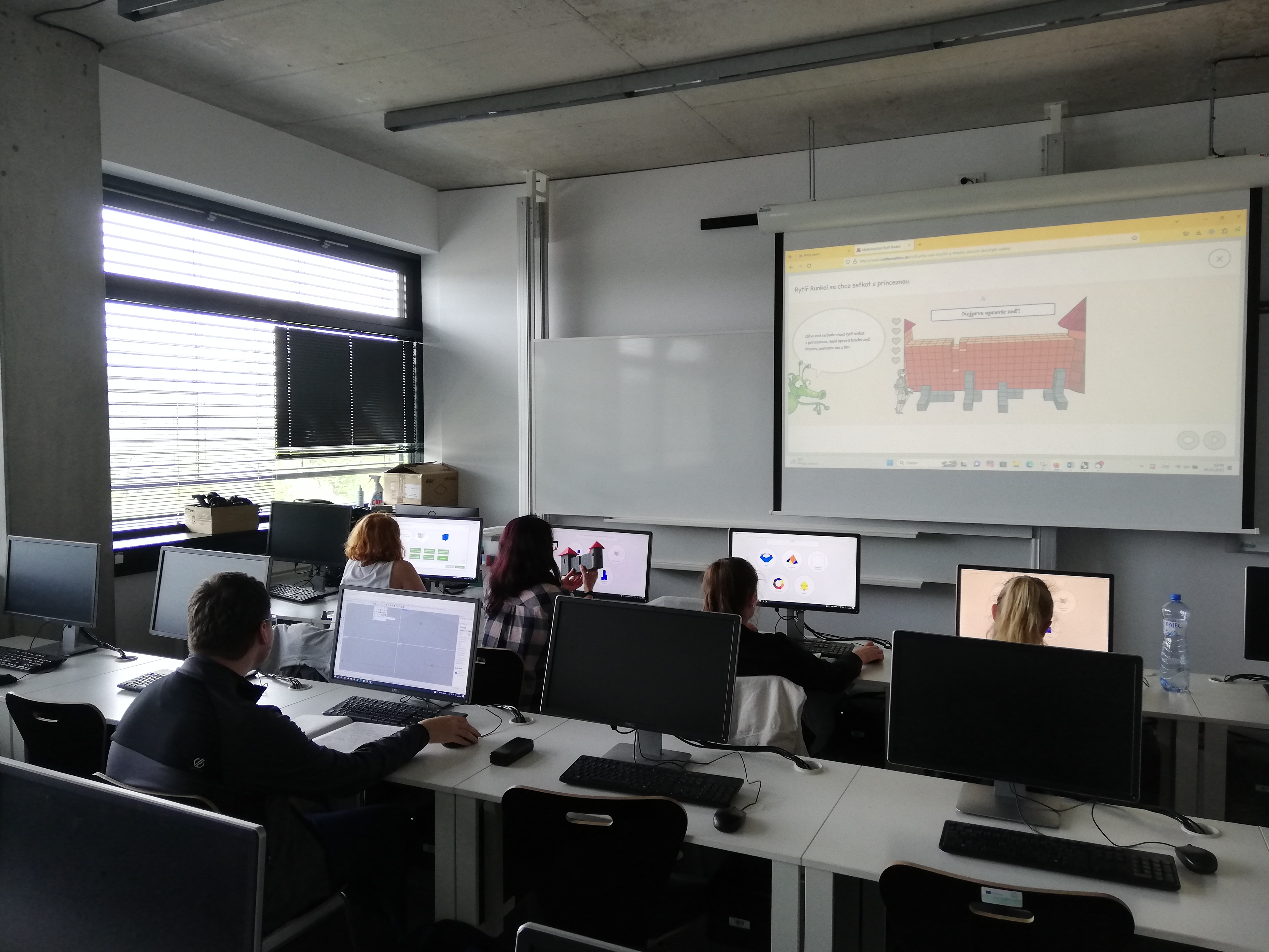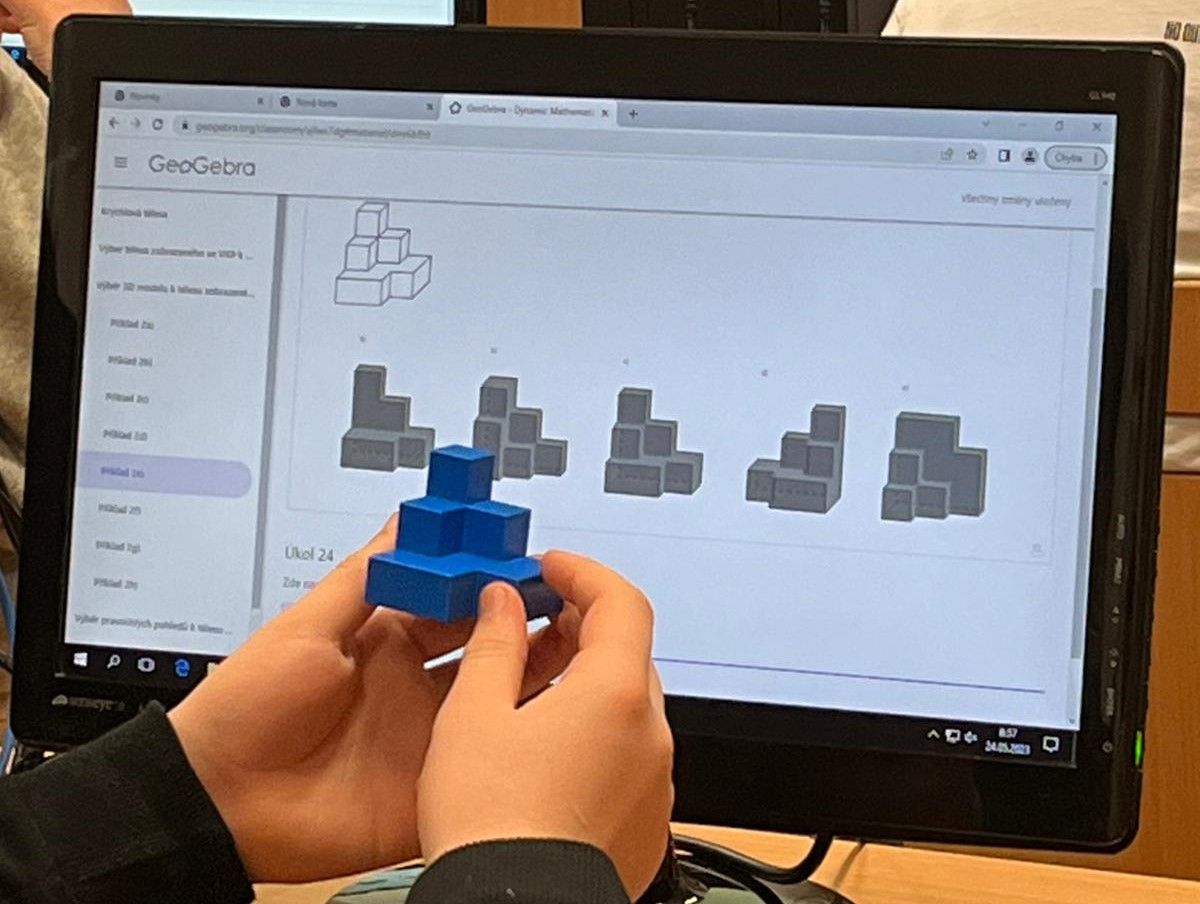 Rádi bychom poděkovali vedení ZŠ Broumovská, Liberec a také paním učitelkám Ing. Daně Chlumské a Mgr. Martině Chlumské za možnost vyzkoušení vytvořené sady úloh zaměřené na rozvíjení vizuálně-prostorových schopností žáků základního vzdělávání. Sada úloh obsahuje úlohy, při nichž dochází k procvičování mentálního vnímání, mentální manipulace a rotace s prostorovými objekty, kterými jsou krychlová tělesa a krychle seříznuté různými rovinami. Při řešení úloh žáci pracují s různými modely těles, a to s průměty těles zobrazenými ve volném rovnoběžném promítání, s virtuálními modely těles vytvořenými v rovnoběžném promítání ve 3D grafickém okně programu GeoGebra, ale také s 3D vytištěnými fyzickými modely těles. Implementace úloh v praxi proběhla koncem května 2023 v jedné z 8. tříd. K testovaným žákům se dobrovolně přidalo několik i žáků z 9. tříd. Ti sami projevili zájem přijít si vyzkoušet řešit pro ně méně standardní úlohy.