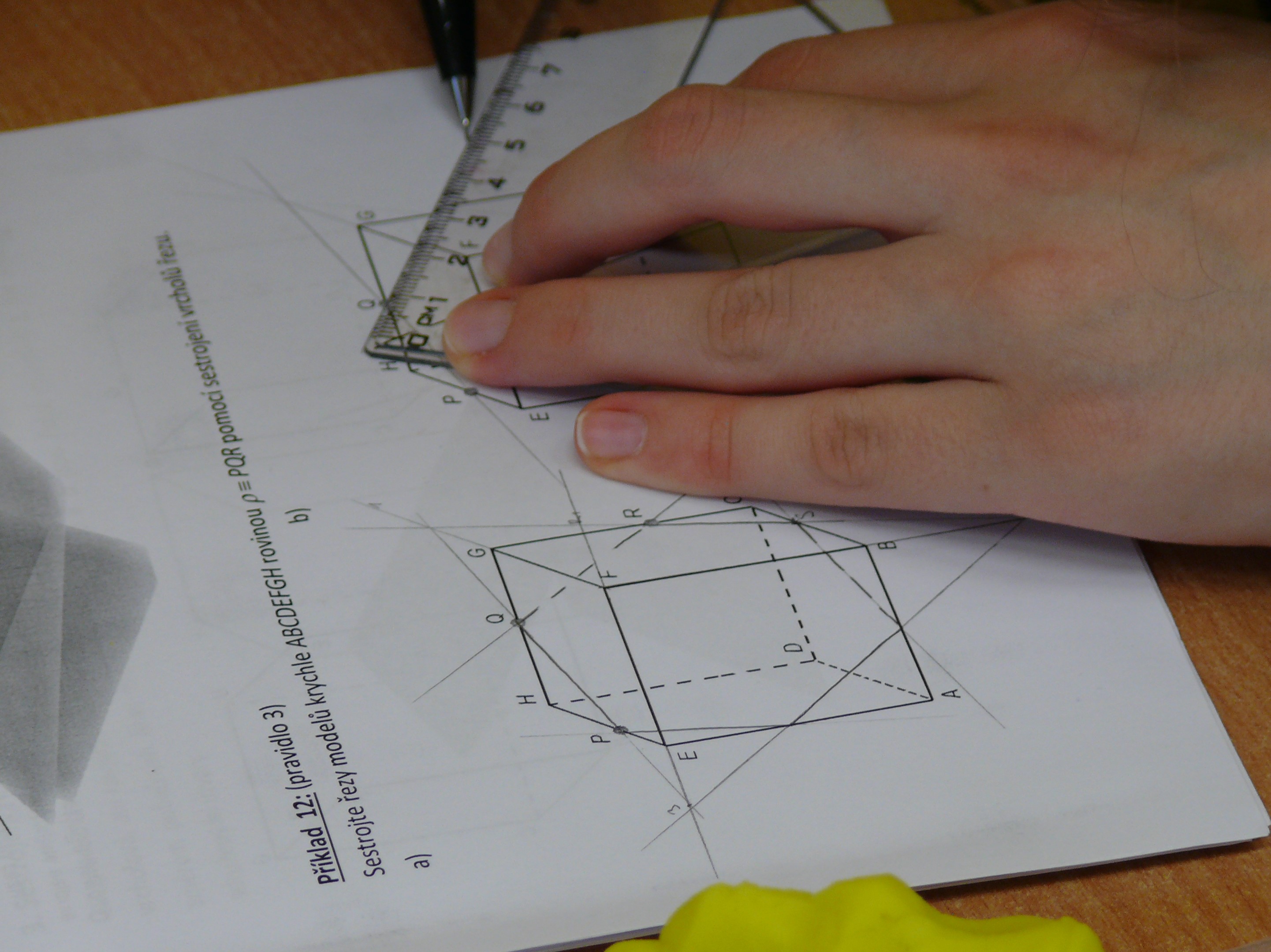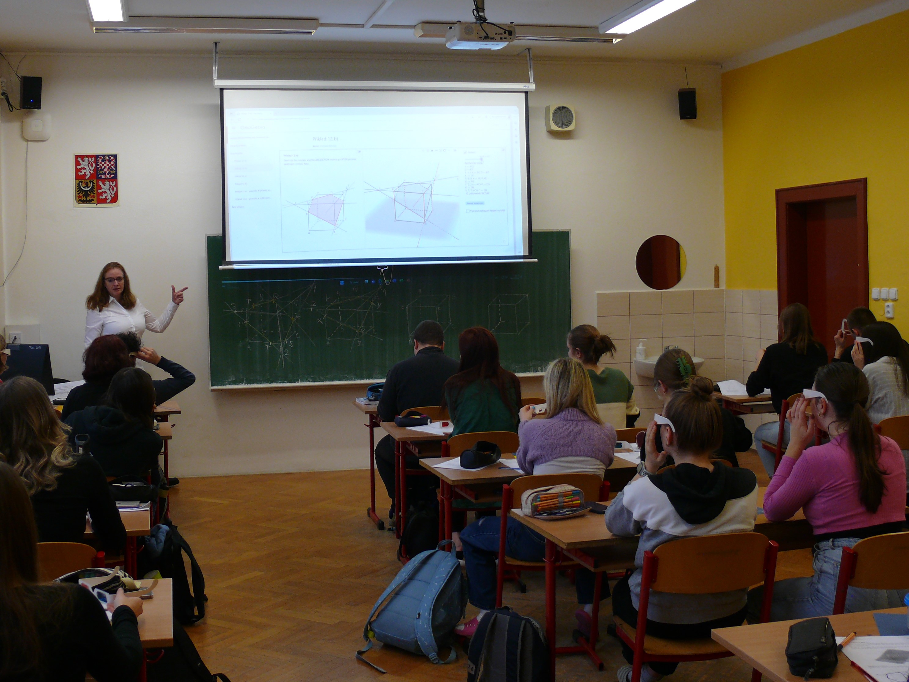 Ve třídě 3.B jsme po předběžné domluvě s vyučující navázali na právě probíraná témata ze stereometrie vysvětlením a následným procvičováním řezů hranatých těles. K výkladu jsme s výhodou používali vytvořené dynamické applety vzorově řešených úloh, které jsme doplňovali názornými ukázkami na 3D vytištěných modelech seříznutých krychlí a jehlanů. Podrobnější popisy uskutečněné implementace jsou publikovány ve článcích: