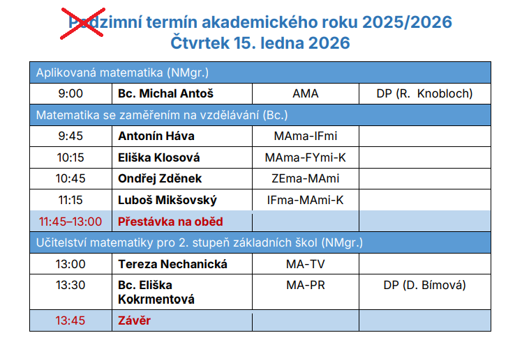 Harmonogram státních závěrečných zkoušek (SZZ) z matematiky na zimní (tj. první) termín akademického roku (AR) 2025/26